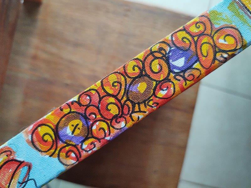 A Clorinda é uma mulata amarela linda, olhos laranjas, intensos, cabelos divertidos e coloridos. Sempre enfeitada! Leva dois amigos nos ombros, amigos super alegres! As “mesas-olho”, roxas, gravitam em volta dela, num fundo azul esverdeado. Desenho nas laterais.