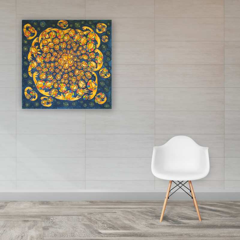 Reproduzi nesta obra minha vontade mais profunda de explodir minha vida no mundo, de respirar, de abraçar o mundo todo, num momento contrário ao confinamento, à retração, à paradeira, à falta de respiração, momento de portas e caras fechadas, tapadas, com medo do outro.