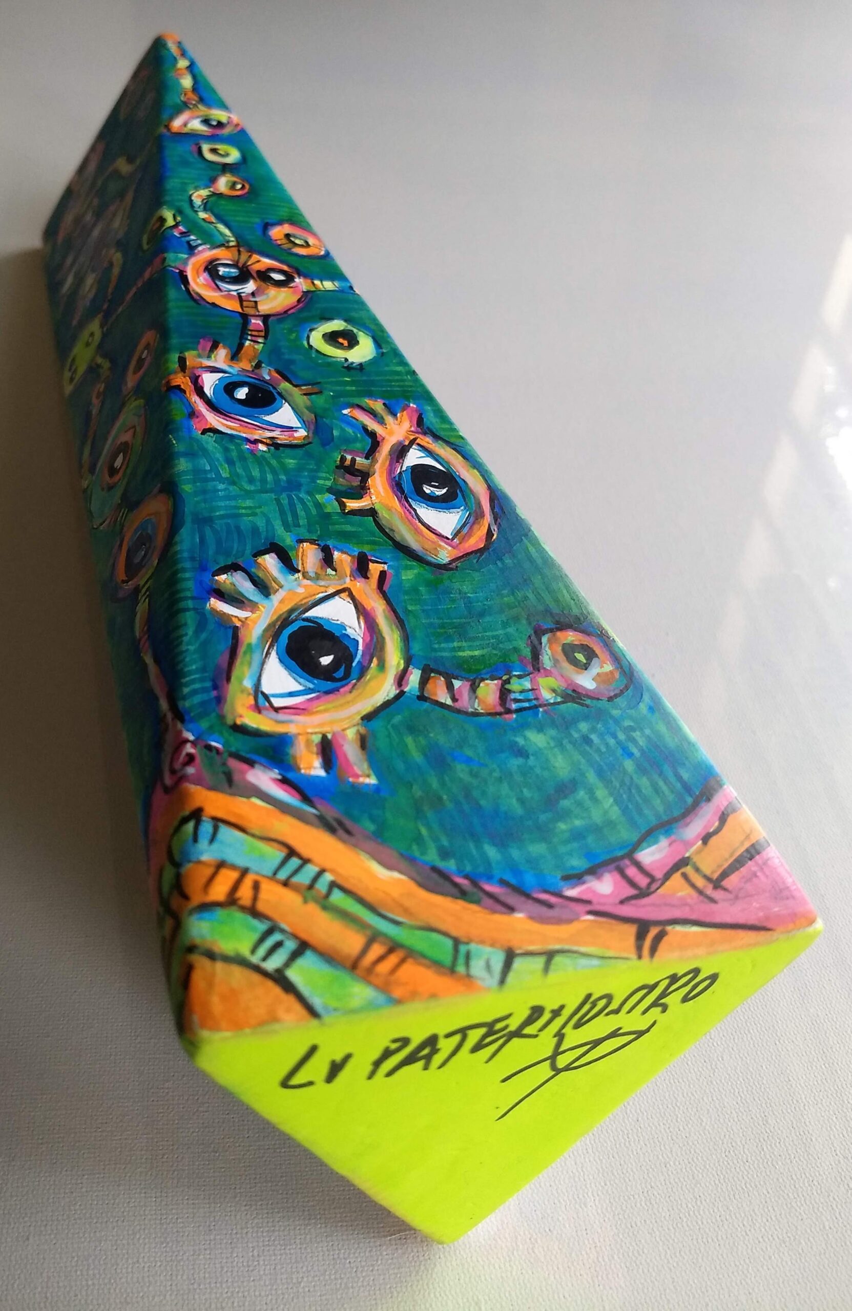 Em formato de um obelisco triangular irregular e com a boca deslocada do pé. Formato bem diferente e interessante. Desenho na parte de fora. Assinatura em baixo da peça.