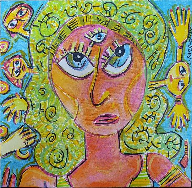 Serestina, mulher vaidosa, morena de olhos bem azuis. De seus cabelos saem os amigos. Seu cabeço é verde e o fundo da tela é azul.